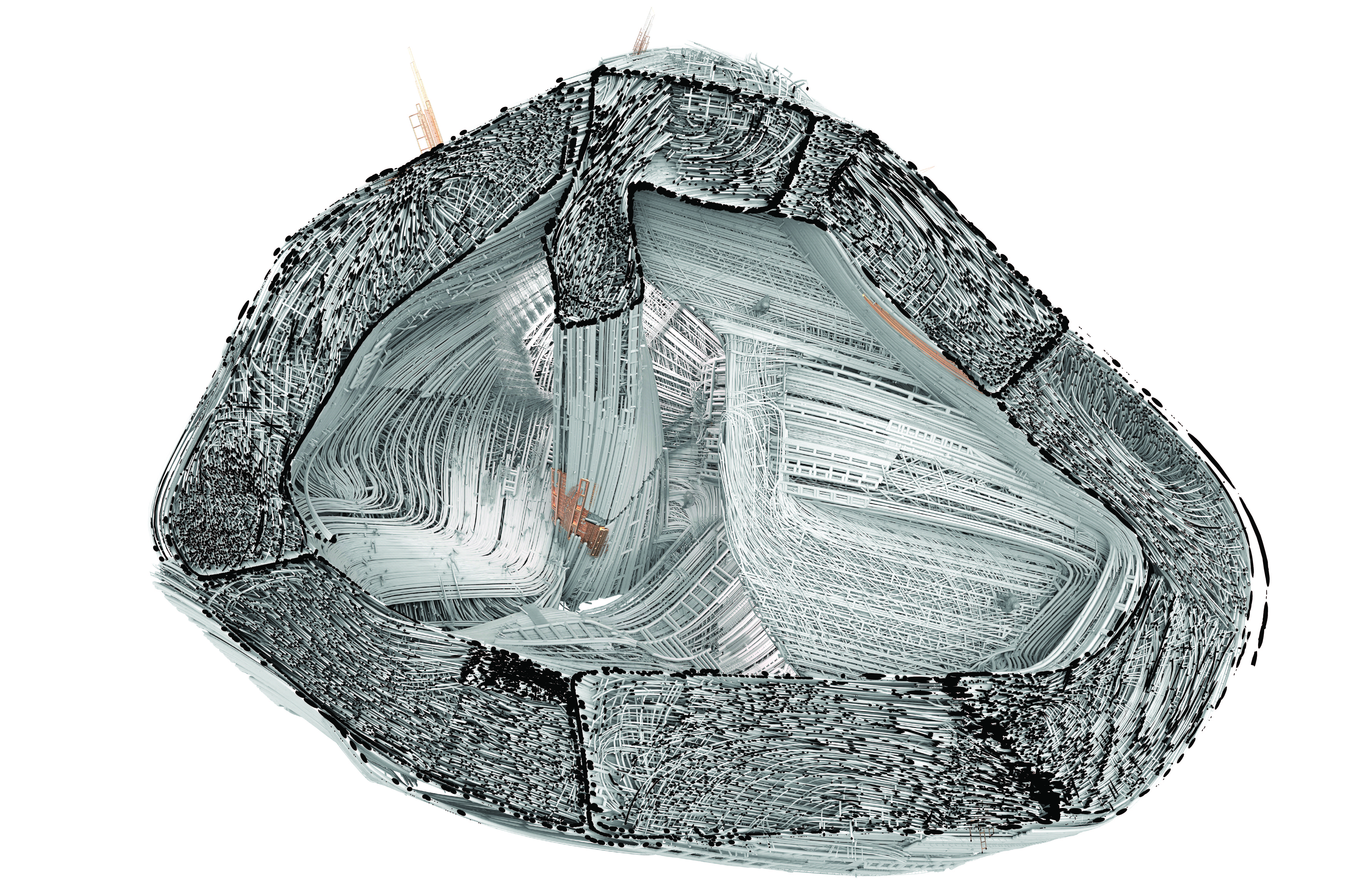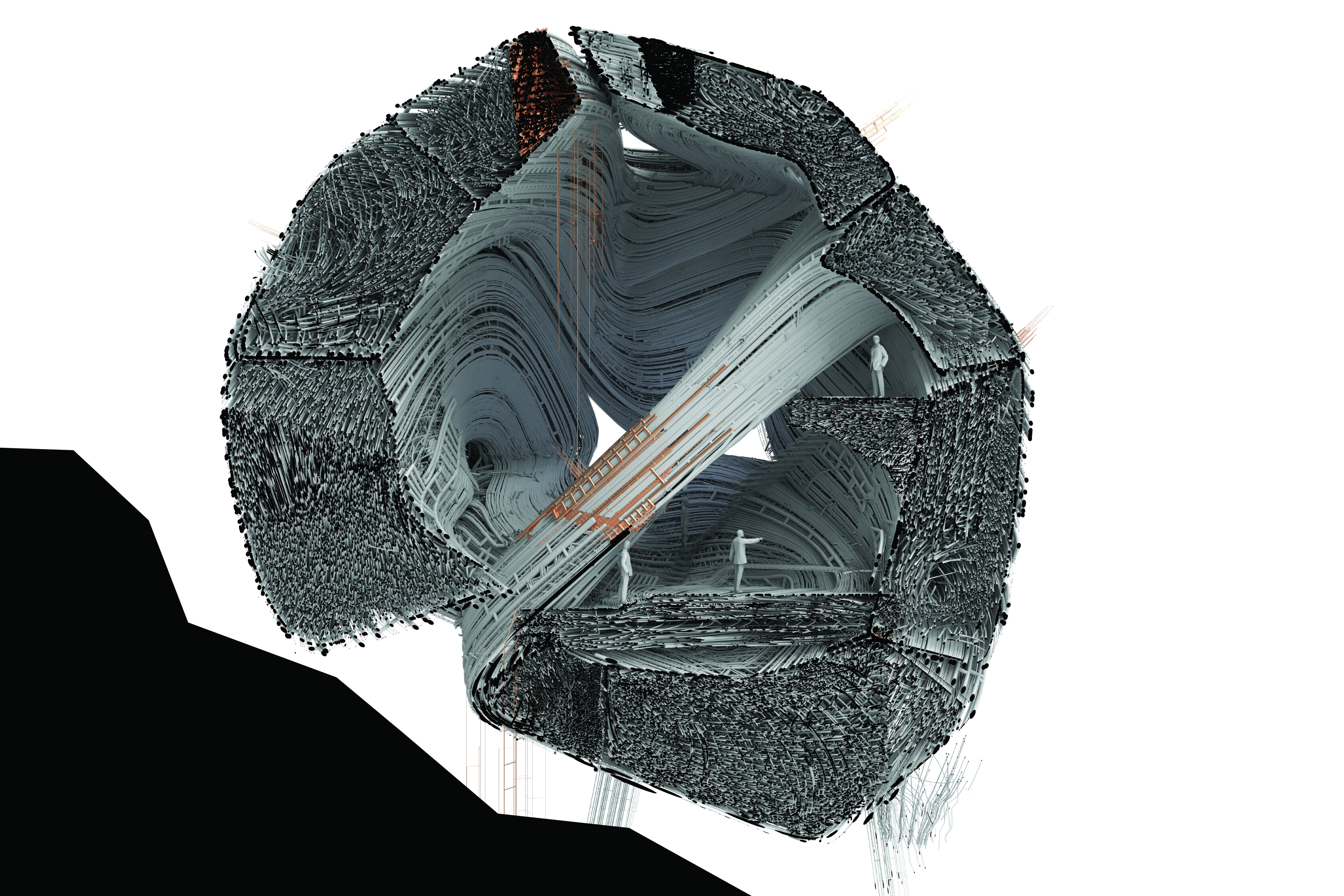 BaRock is only bound by its form, but always folding into space. This is defined by the outlines of the original base mass on the flow diagram. Within this space BaRock has 2 infinities: our coils of piping and the folds themselves. BaRock folds are always open ended and in exhaustive, where there is always space to grow despite its parameters. The object is in a constant state of action, beyond what we can denote as movement. While some coils move and fold at lighting speed, others act as a fluid solid, the way older panes of glass “melt” within their frame. The coils and the fold are excessive and unlimited. Every layer of piping is creative, generative, and an ongoing process, which allows for alternative actualizations of the piping. These actualizations act to enhance the depth and fluidity of the folds. What brings out the fold is the flux between exteriority and interiority. In the interior, the folds produce an atmosphere where our desire for inhabitation connotes stairs and floor plates, this is not a particular operation of the object machine. According to Deleuze affect is not dependent upon the perception of man and can change at any moment as the object continues its folding, producing new affects.